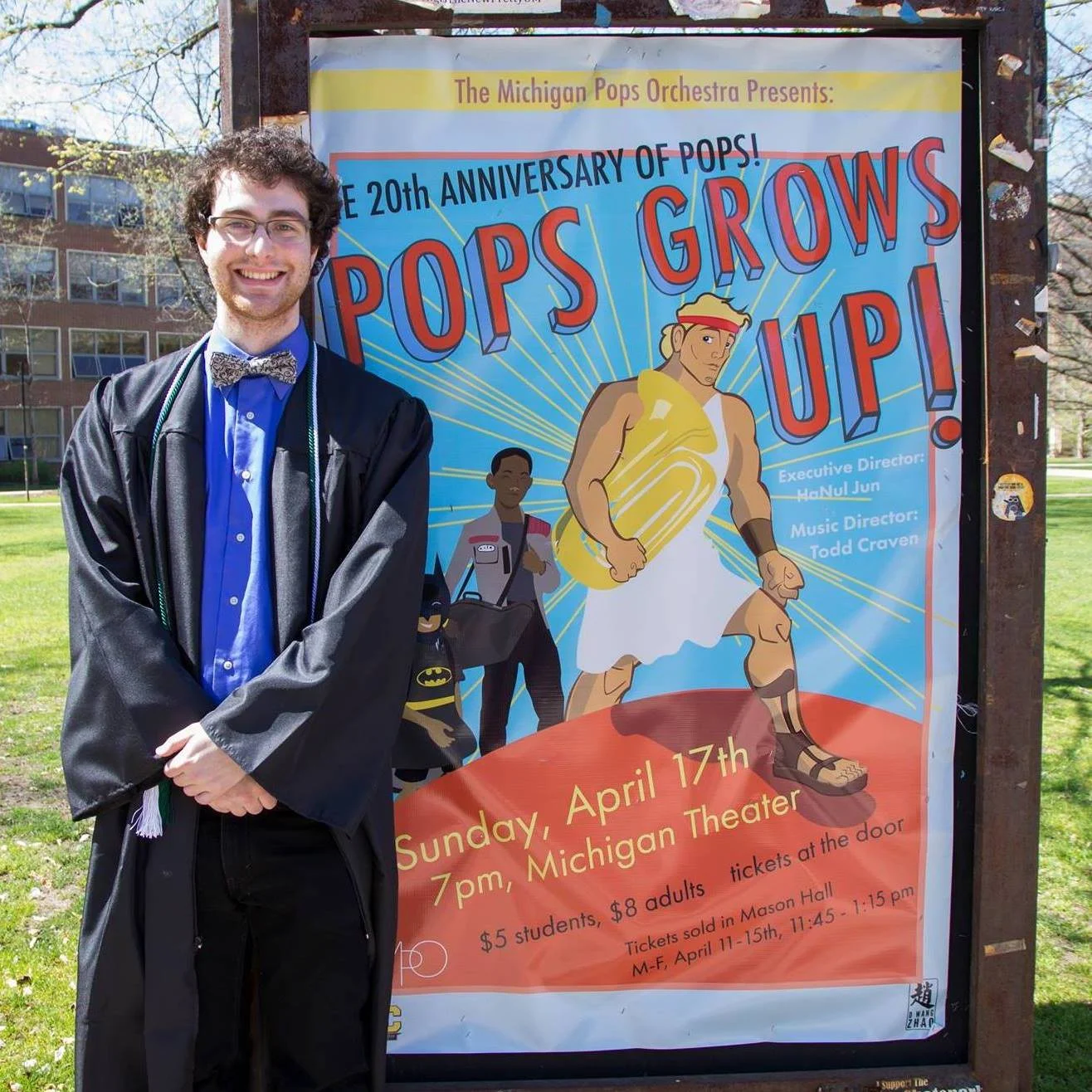RL: YES, I want to share a story! When I showed up to Michigan, I stumbled upon Pops at Festifall, and I just happened to find the Pops table and sign up for the info session and audition and all of that. But I had no idea that it existed otherwise – it was purely by circumstance. The year that I graduated, I went back to my old high school where my sister was graduating, and I went to her orchestra concert. Their orchestra was really well known because they were a good group; they’d been invited to play at Carnegie Hall. The seniors got to stand up and share with the audience what their plans were after graduation. 9 out of 10 of them who were going to Michigan said, “I’m going to go try to join the Michigan Pops Orchestra.” I was just floored that they had all heard about it and that that was their new goal. That made me really happy!
